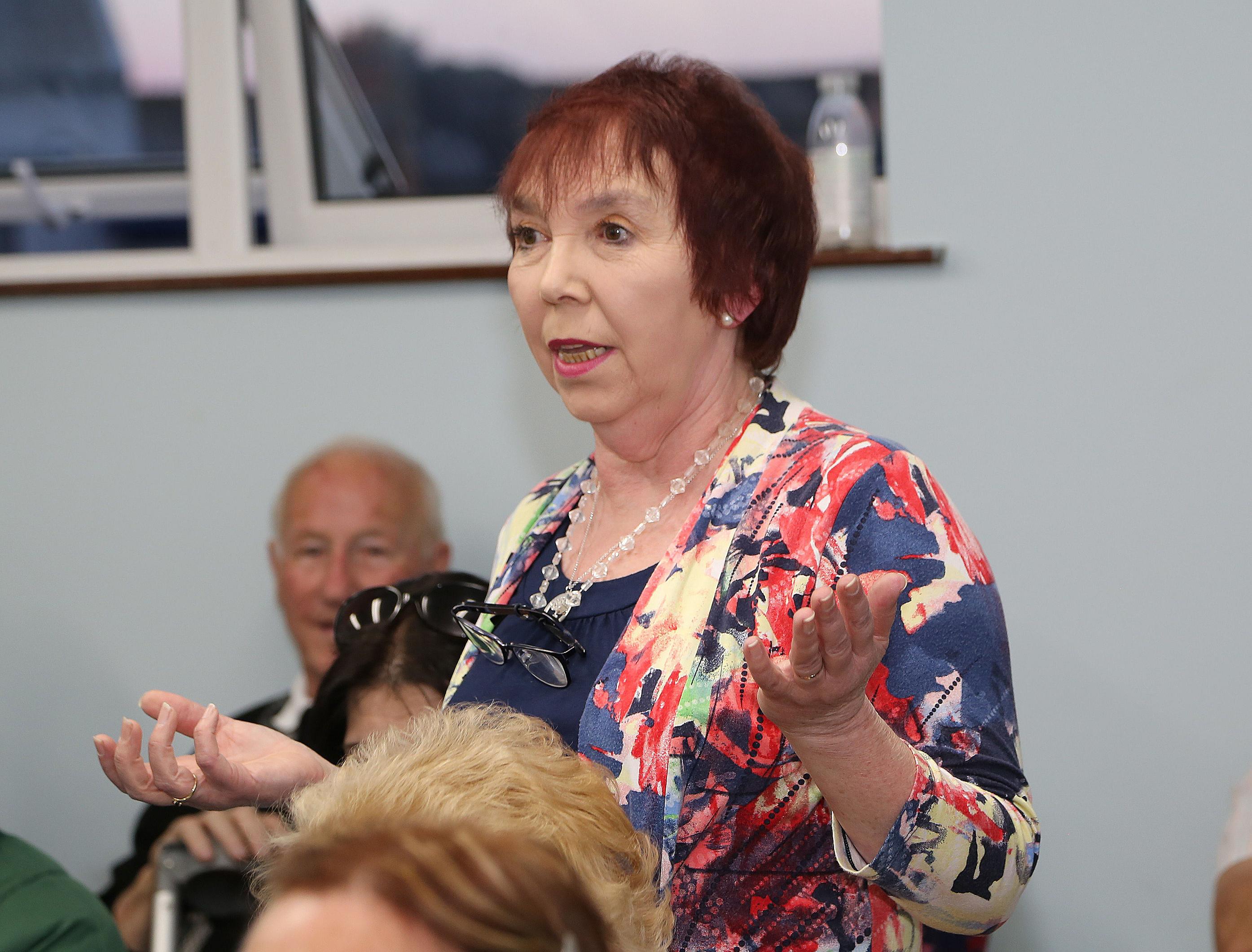 Mary Power, postmistress, Kilmacthomas Post Office, speaking at the meeting in the Rainbow Hall. Photo: John Power.