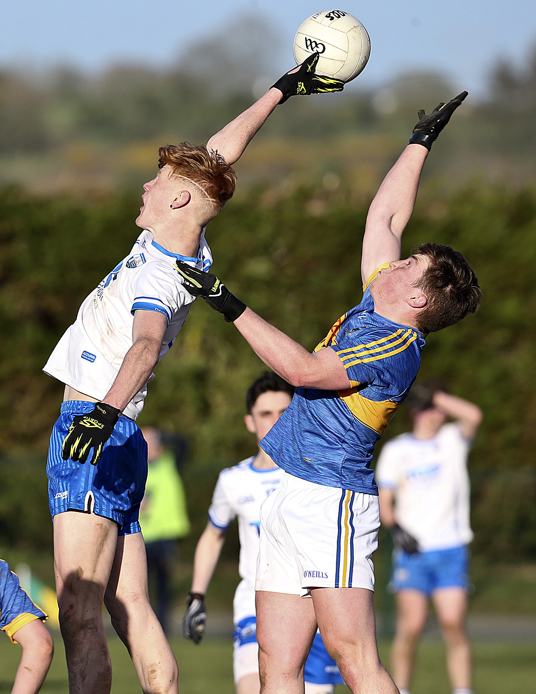 Waterford's Larry Walsh in an aerial duel with Tipperary's Gavin Meagher during last year's Munster Minor Football play-off match in Lemybrien. The 2019 Deise minors are currently without management following last week's upheaval. | Photo: Sean Byrne