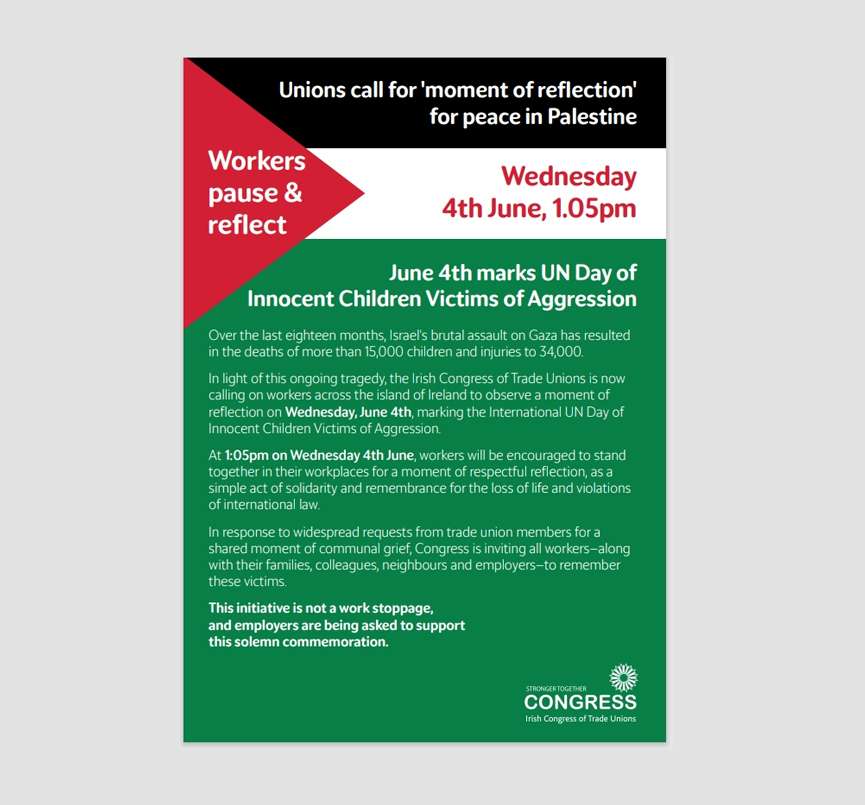 The Irish Congress of Trade Unions is calling for all workers to pause and reflect in a moment of reflection today, Wednesday, 4th June, as part of UN Day of Innocent Children Victims of Aggression.