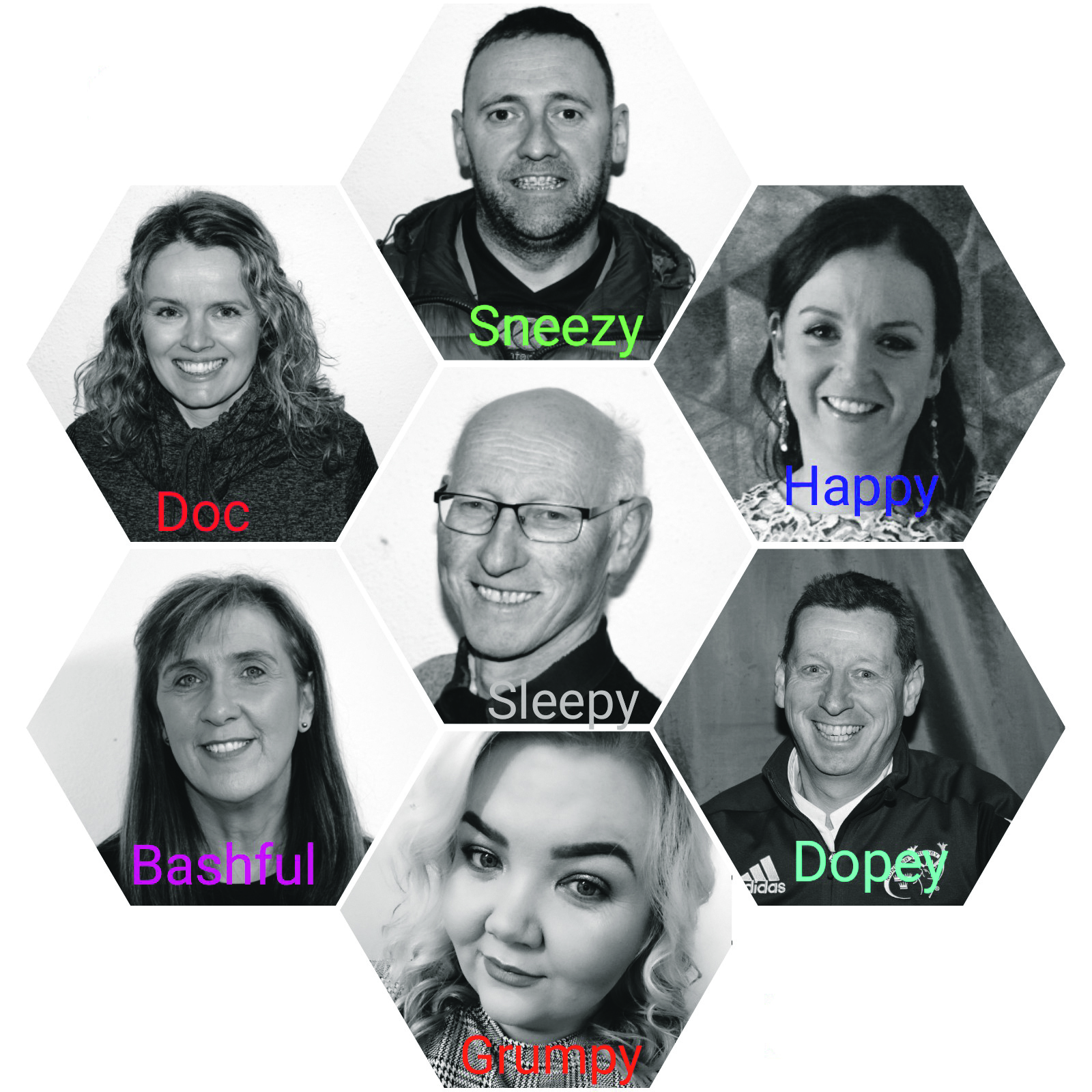 The Seven Dwarfs who will be treading the boards at the Premier Hall between Wednesday and Sunday. Centre: David Walsh (Sleepy), Top: Fred Kelly (Sneezy), Bottom: Rachael Butler (Grumpy), Bottom Left: Gemma Maher (Bashful), Bottom Right: Kieran Laffan (Dopery), Top Left: Niamh Doherty (Doc) and Top Right: Lillian Clery (Happy).