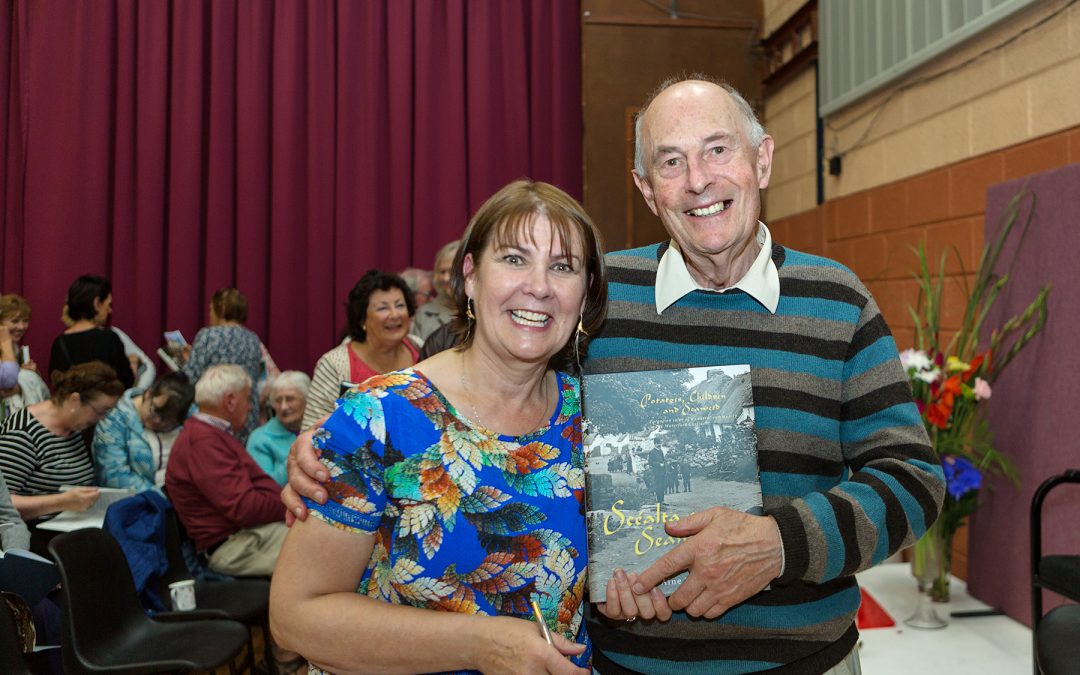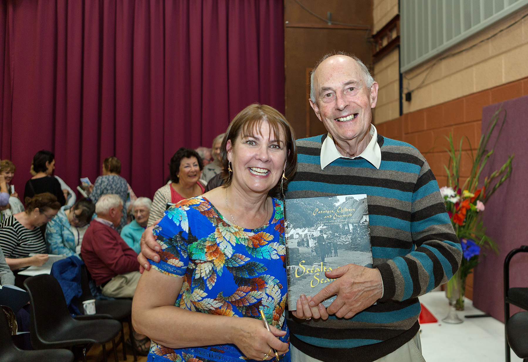 Áine Uí Fhoghlú and Julian Walton at the launch of “Scéalta agus Seanchas – Potatoes, Children and Seaweed” in An Rinn.